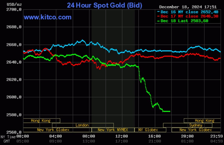 Mỗi ounce vàng giảm hơn 60 USD, trong khi các chỉ số chủ chốt của Wall Street mất 3% khi Fed muốn lãi suất giảm chậm lại.